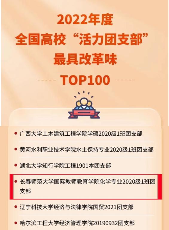 近日,在由共青团中央基层建设部指导、中国青年报社开展的2022年度高校“活力团支部”风采展示活动中,我校国际教师教育学院化学专业2020级1班团支部被评为2022年度全国高校“活力团支部”最具改革味TOP100榜。