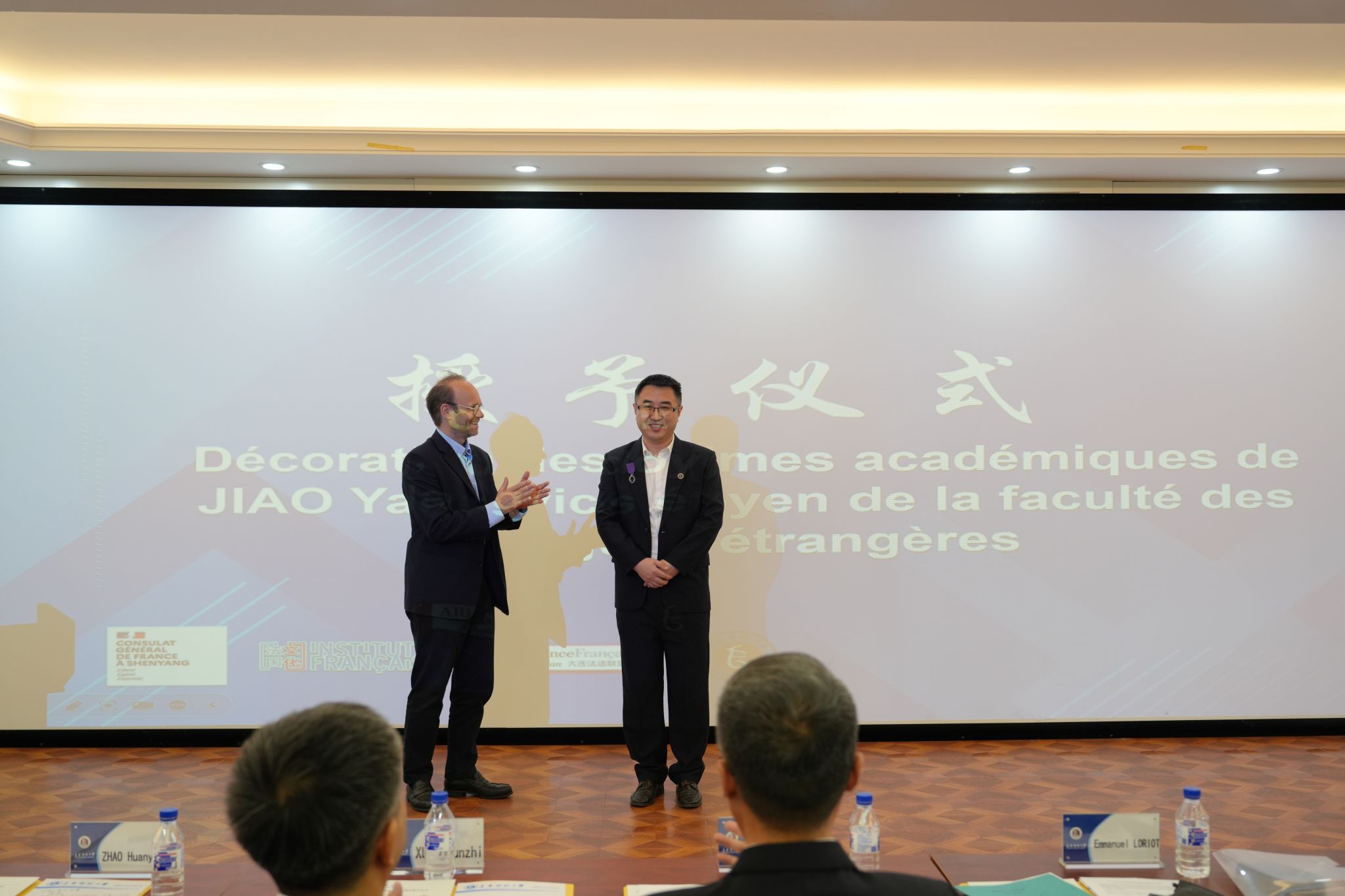 5月25日,法国驻沈阳总领事馆总领事罗毅睿先生为我校外国语学院副院长焦旸教授颁发我校首位法兰西共和国学术棕榈骑士勋章,以表彰其在中法文化交流和法语教育领域中做出的卓越贡献。