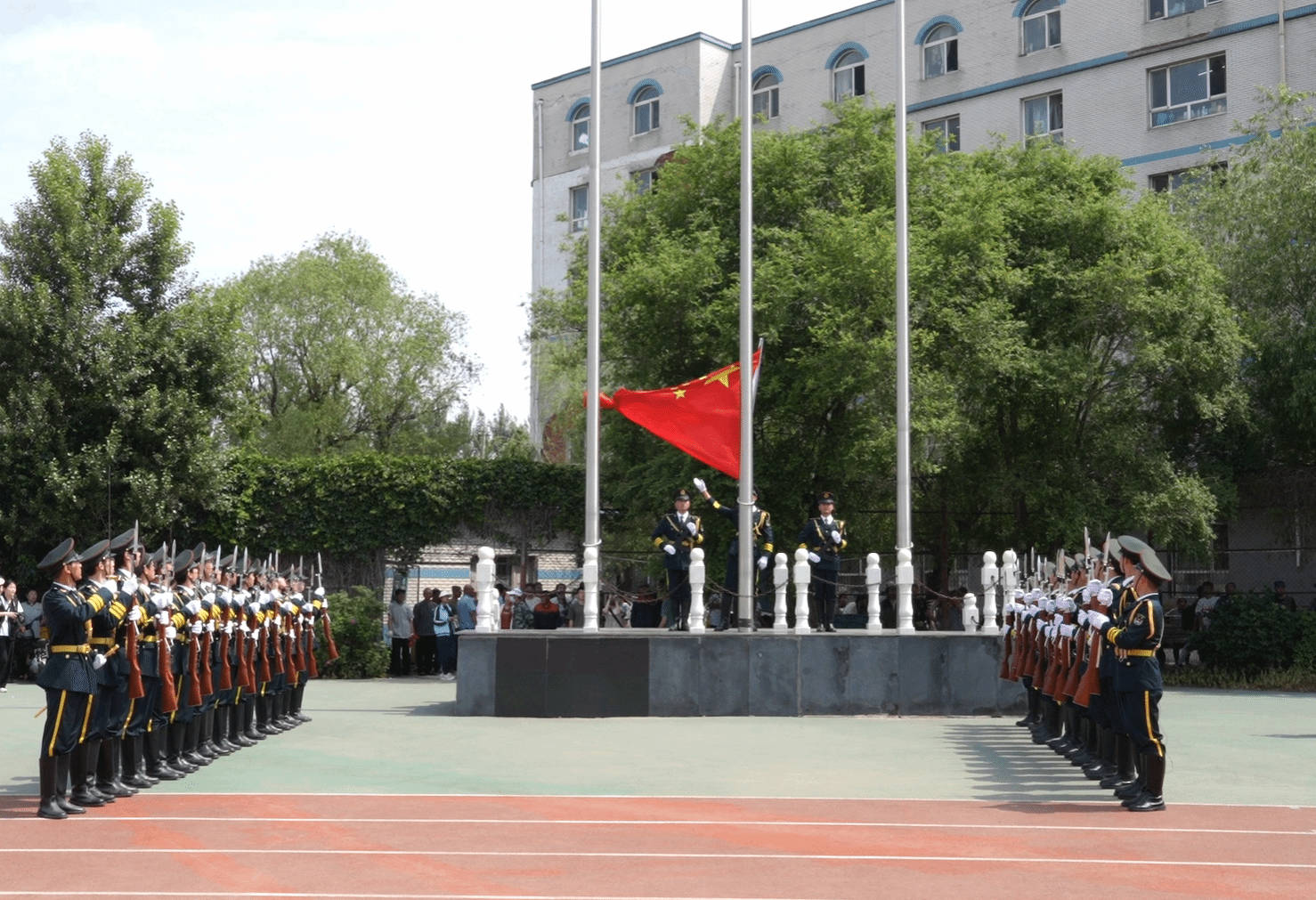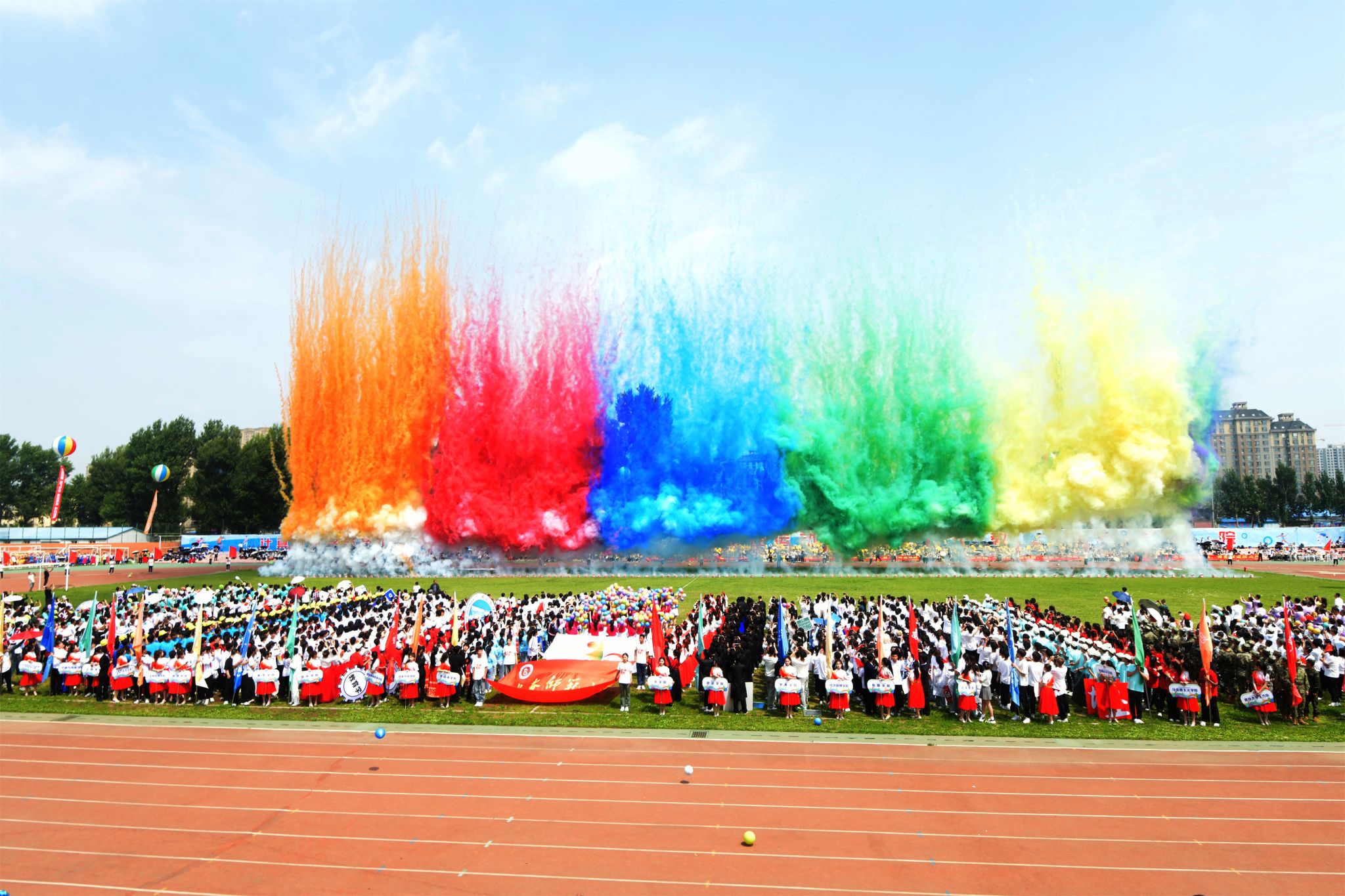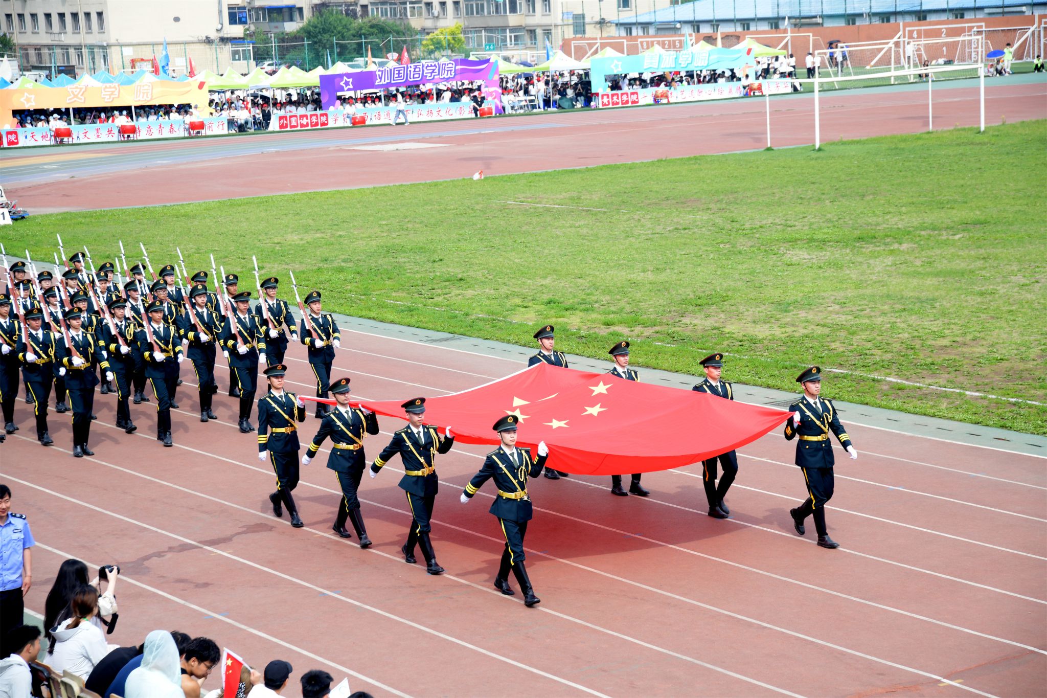 在庄严雄壮的国歌声中,五星红旗在田径场冉冉升起。