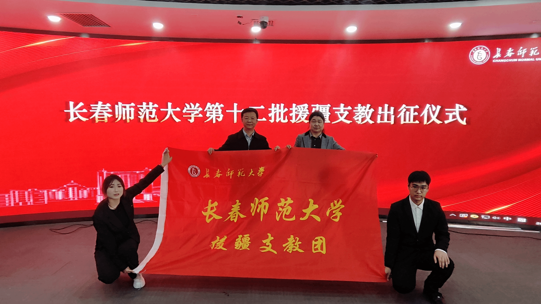 随后,刘鹏飞代表学校为第十二批援疆支教团授旗。