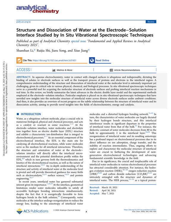 近日,久久久久国产成人精品亚洲综合_亚洲精品国产A久久久久久_精品亚洲日韩国产精品一区二区三区_AV无码久久无码_国产精品国产亚洲精品看不卡_午夜亚洲精品国产乱码久久久人妻_久久久99无码精品一区二区三区_欧美日韩精品国产精品一区二区三区高清免费物理学院教师李姗姗,在国际权威期刊Analytical Chemistry(中科院一区TOP)上发表了题为"Structure and dissociation of water at the electrode-solution interface studied by in situ vibrational spectroscopic techniques"的综述文章。李姗姗为论文第一作者和通讯作者,中国科学院长春应用化学研究所姜秀娥研究员为共同通讯作者。